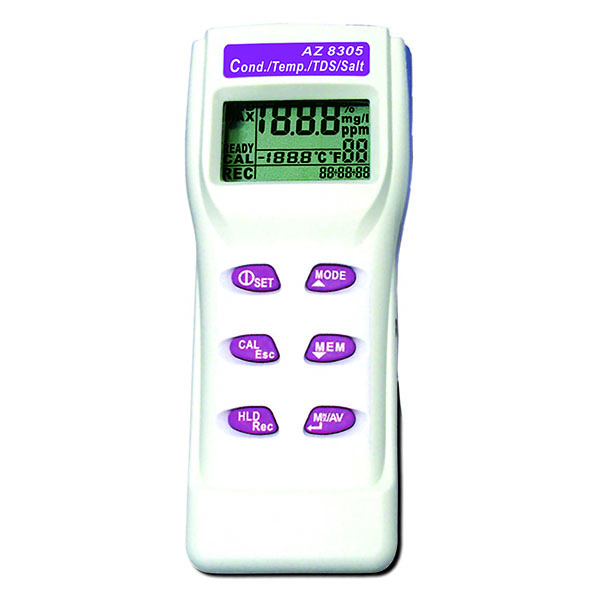 Pengukur Konduktivitas Portabel 8305 AZ dapat mengukur Konduktivitas / TDS (Total Dissolved Solid) / Salinitas dan Temperatur. Ini memiliki layar LCD besar untuk menampilkan beberapa parameter. Elektroda sensor Konduktivitasnya memiliki daya tahan tertinggi dengan pengukuran yang andal.