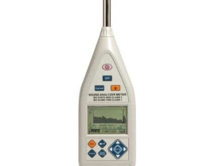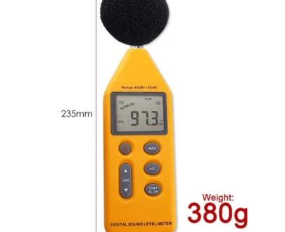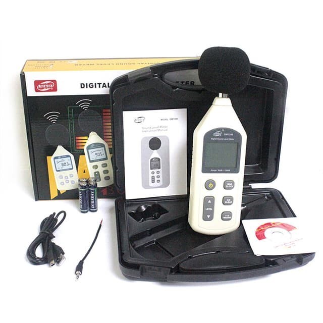 Alat pengukur tingkat kebisingan. Mengukur tingkat kebisingan dalam satuan desibel (dB). Untuk industri, konstruksi, home theater, penelitian, dll