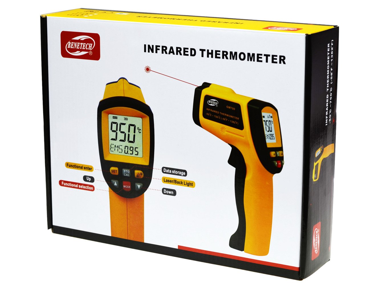 Benetech GM1850 Infrared Thermometer & Analysis Software adalah alat ukur suhu digital yang digunakan untuk mengukur temperatur permukaan objek tanpa kontak langsung dengan memanfaatkan teknologi inframerah. Alat ini mampu mengukur suhu tinggi dalam rentang 200°C hingga 1850°C dengan cepat dan akurat. Thermometer ini dilengkapi laser pointer, layar LCD dengan backlight, serta fungsi penyimpanan data hingga sekitar 4000 data. Selain itu, alat ini dapat terhubung ke komputer melalui interface RS232 dan software analisis, sehingga memudahkan pengguna dalam menyimpan, memantau, dan menganalisis hasil pengukuran suhu secara lebih detail.