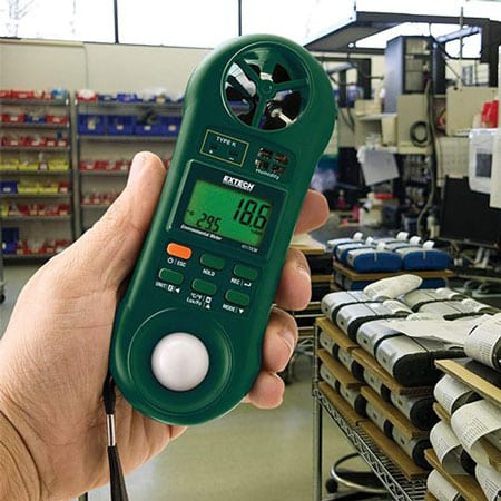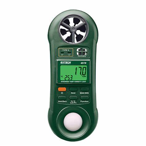 Alat ukur 4-in-1 ini mengukur Kelembaban, Suhu, Kecepatan Udara, dan Cahaya. LCD ganda menampilkan Suhu dan Kecepatan Udara atau Kelembaban Relatif secara bersamaan. Pengukuran suhu udara atau permukaan yang tinggi dapat dilakukan menggunakan input Tipe K bawaan. Dilengkapi dengan sensor Kelembaban bawaan, sensor Cahaya, dan roda baling-baling, tali pergelangan tangan, dan baterai 9-Volt.