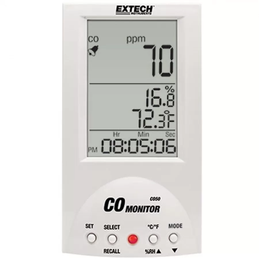 Mengukur konsentrasi Karbon Monoksida, Suhu Udara dan Kelembaban CO50 adalah Monitor CO desktop yang mengukur dan menampilkan konsentrasi karbon monoksida, suhu udara dan kelembaban secara bersamaan. CO50 menampilkan lampu LED terang yang mengindikasikan pemantauan aktif (hijau) atau ambang batas alarm CO (merah).