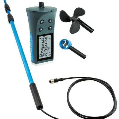 Dikembangkan untuk digunakan dalam berbagai kondisi lapangan yang menantang. Impelernya yang berbeda mengukur hampir semua media cairan, cairan, atau gas. Pengukuran fluida dapat dilakukan dalam knot, km / jam, mph, dan m / s. Meteran juga mengukur suhu baik dalam ° F atau ° C, termasuk suhu minimum dan maksimum dan suhu saat ini. Juga disertakan adalah impeler kecepatan angin yang memungkinkan Anda mengukur kecepatan udara dan kecepatan angin.