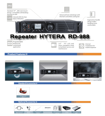 Jual HYTERA RD988 dengan harga murah dan garansi resmi dari distributor. Dapatkan produk terbaik dengan spesifikasi lengkap. Produk berkualitas tinggi dengan sertifikat kalibrasi (Certificate of Calibration) dari pabrik dan original/asli. Barang yang kami jual sudah melalui Quality Control (QC) dan siap dikirim.