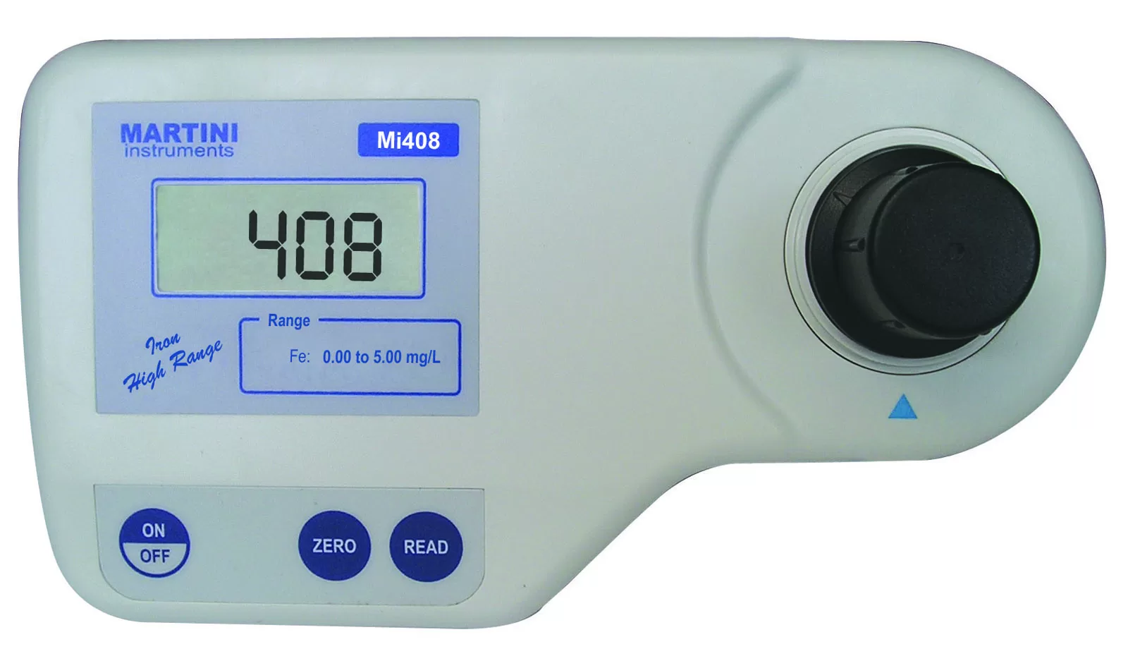 MILWAUKEE Mi408 High Range Iron Photometer is a photometer (colorimeter) for measuring levels of iron (high range), providing direct readings in mg/L. Iron is naturally present in water supplies; yet its presence in both potable and industrial applications is regarded as objectionable. Milwaukee offers the Mi408 microprocessor-based instrument with great resolution, high accuracy, and immediate results for measuring Iron in high concentrations from 0.00 to 5.00 mg/L.