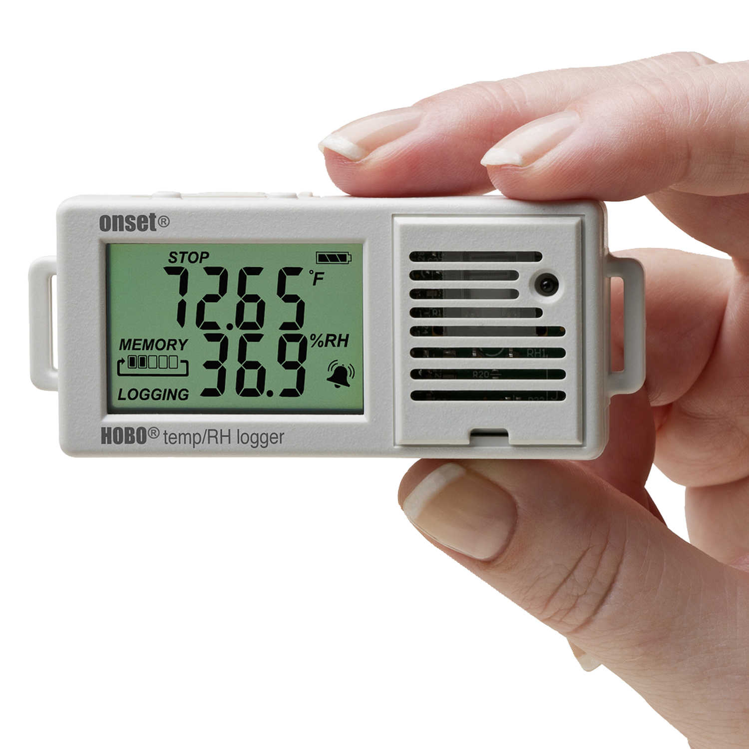 Dengan sensor terintegrasi untuk mengukur dan mencatat suhu dan kelembaban relatif (dengan akurasi 3,5%) di lingkungan dalam ruangan. Logger ini ideal untuk memantau kenyamanan penghuni gedung perkantoran, melacak kondisi penyimpanan makanan di gudang, mencatat tren suhu di ruang server, dan mengukur tingkat kelembapan di museum.