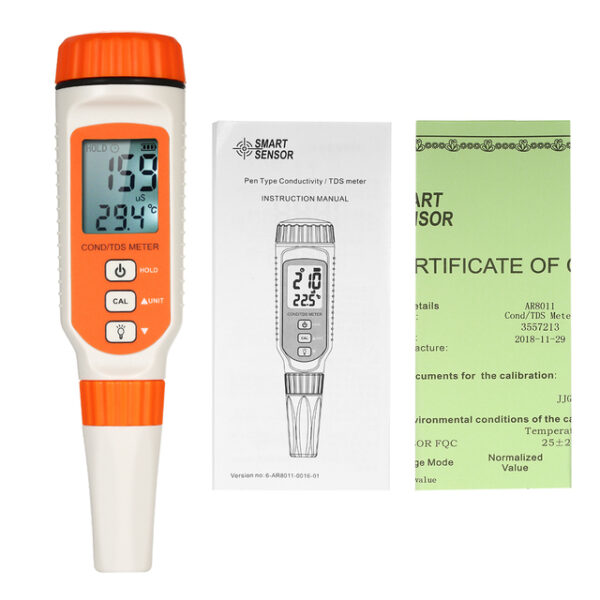 Smart Sensor AR8011 Digital Conductivity Meter adalah alat yang digunakan untuk mengukur konduktivitas listrik larutan. Alat ini menggunakan prinsip pengukuran konduktivitas untuk menentukan konsentrasi ion dalam larutan. Konduktivitas listrik larutan dipengaruhi oleh jumlah ion yang terlarut di dalamnya, sehingga alat ini digunakan untuk mengukur tingkat keasaman atau kebasaan, salinitas, dan kemurnian larutan.