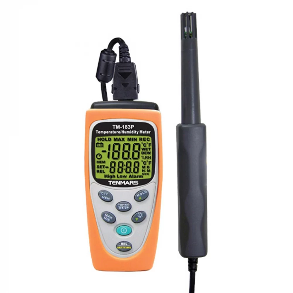 Tenmars TM 183P Temperature&Humidity Meter adalah peralatan yang sempurna untuk aplikasi industri, laboratorium, dan jenis lokasi kerja lainnya, karena chip sensornya yang sangat akurat yang mengukur kelembaban dan suhu relatif.