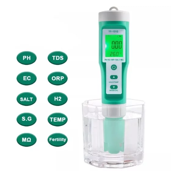 10 dalam 1 Meter pengukuran profesional PH, EC, TDS, ORP, H2, MΩ, Kesuburan, GARAM, SG Temp. cocok untuk air minum rumah tangga, makanan, kolam renang, laboratorium, dan akuarium.
